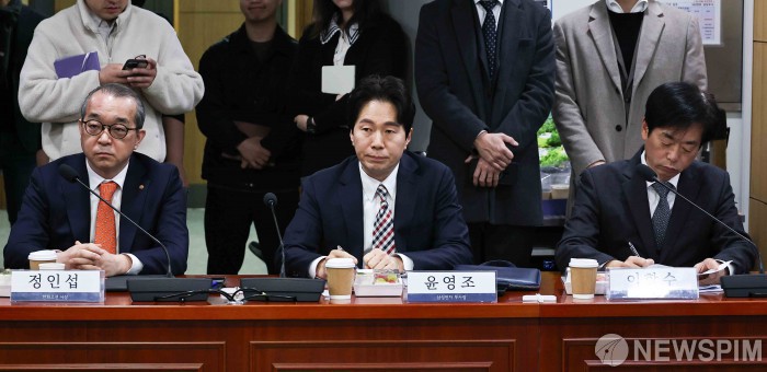 [서울=뉴스핌] 윤창빈 기자 = 정인섭 한화오션 사장, 윤영조 삼성전자 부사장, 이항수 현대자동차 부사장 등 재계 참석자들이 5일 오전 서울 여의도 국회 의원회관에서 열린 중동 현안 관련 더불어민주당-재계 긴급 간담회에서 한정애 더불어민주당 정책위의장의 모두발언을 듣고 있다. 2026.03.05 pangbin@newspim.com