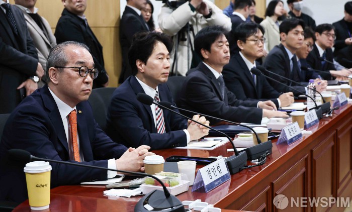 [서울=뉴스핌] 윤창빈 기자 = 정인섭 한화오션 사장, 윤영조 삼성전자 부사장, 이항수 현대자동차 부사장 등 재계 참석자들이 5일 오전 서울 여의도 국회 의원회관에서 열린 중동 현안 관련 더불어민주당-재계 긴급 간담회에서 한정애 더불어민주당 정책위의장의 모두발언을 듣고 있다. 2026.03.05 pangbin@newspim.com