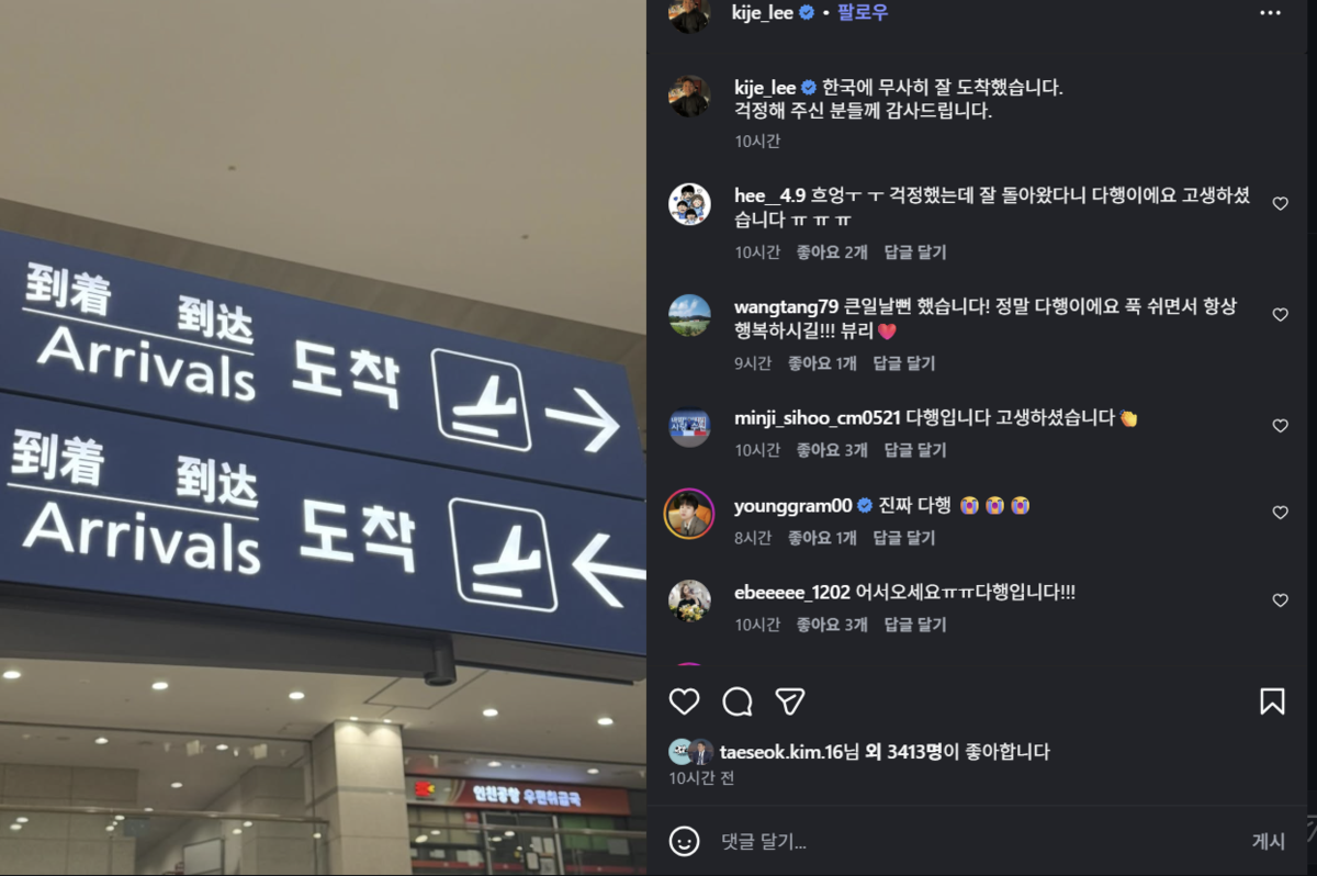 이기제는 4일 오후 10시쯤 자신의 사회관계망서비스(SNS)에 인천국제공항 입국장 사진을 올리며 “한국에 무사히 잘 도착했습니다. 걱정해 주신 분들께 감사드립니다”라고 밝혔다.