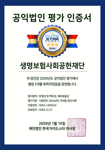 생명보험사회공헌재단(이사장 이장우)은 한국가이드스타 주관 공익법인 평가에서 9년 연속 최우수 등급 '별 3점'을 획득했다고 5일 밝혔다.