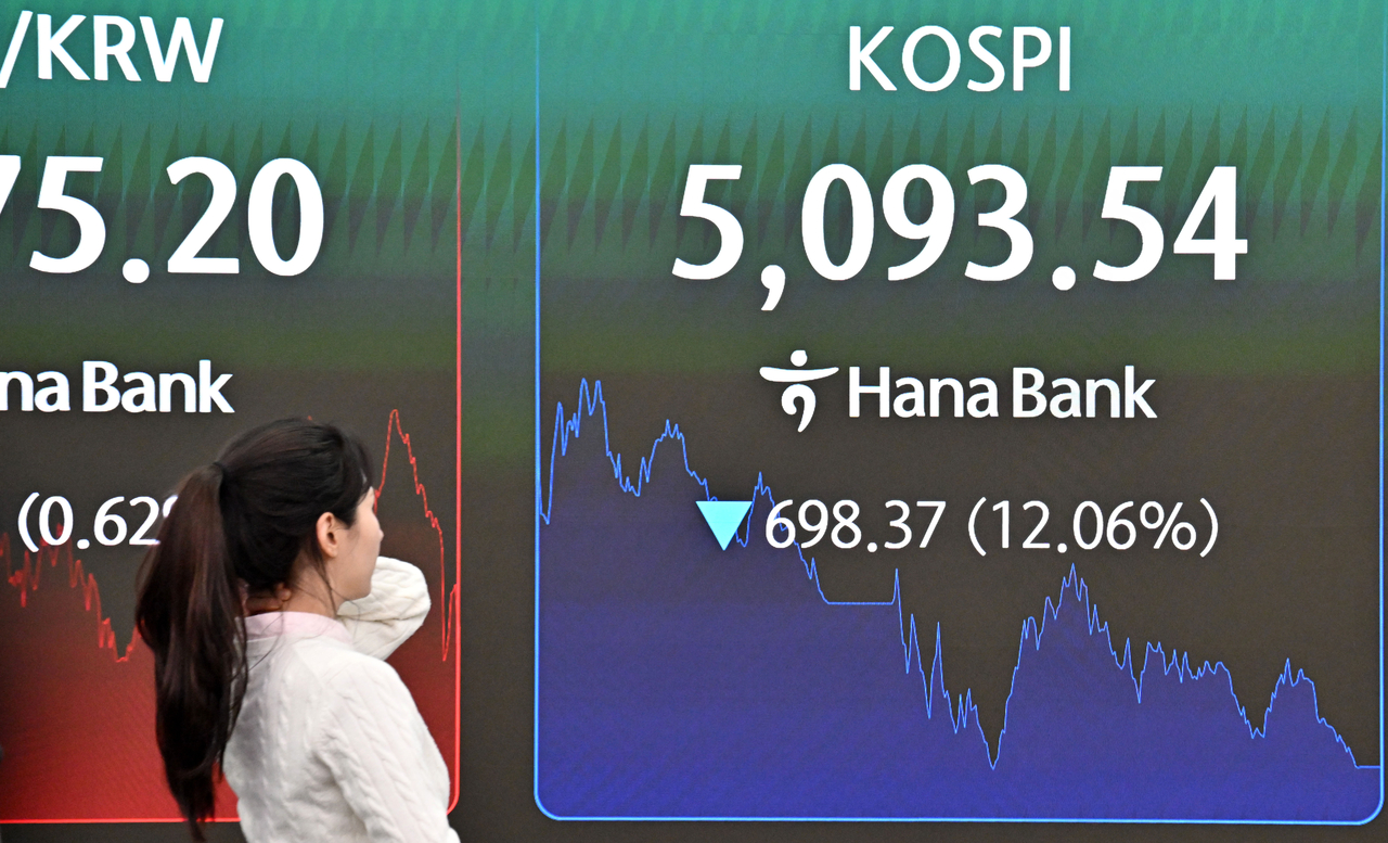 코스피 지수가 4일 미국과 이란 간 전쟁 발발 여파로 역대 최대 폭으로 폭락해 전장보다 698.37포인트(12.06%) 내린 5093.54에 장을 마쳤다. 이날 오후 서울 중구 하나은행 딜링룸 전광판에 코스피 지수가 표시돼 있다. 임세준 기자 |