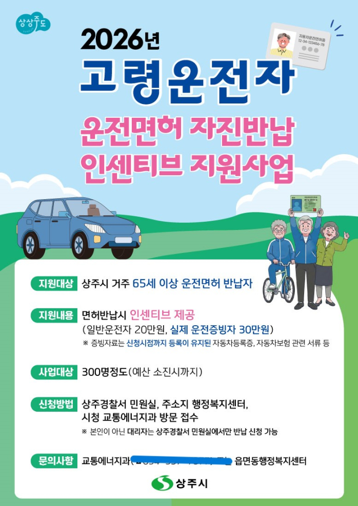 상주시는 고령자 운전면허 자진반납에 따른 인센티브를 올해부터 최대 30만원까지 확대 시행한다고 5일 밝혔다.