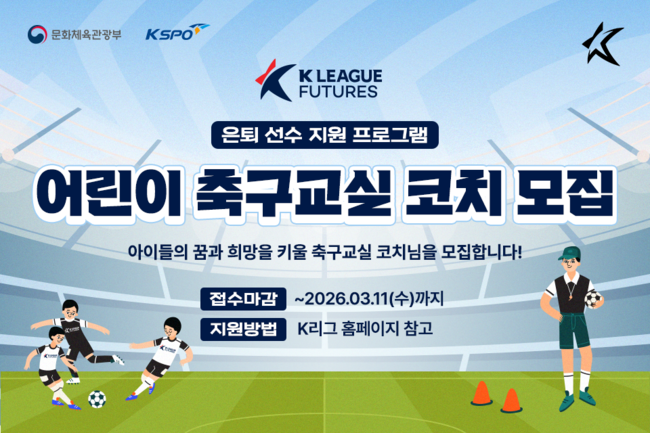 [OSEN=이인환 기자] 한국프로축구연맹(총재 권오갑, 이하 ‘연맹’)이 ‘K리그 퓨처스 어린이 축구교실’을 함께할 코치를 공개 모집한다.