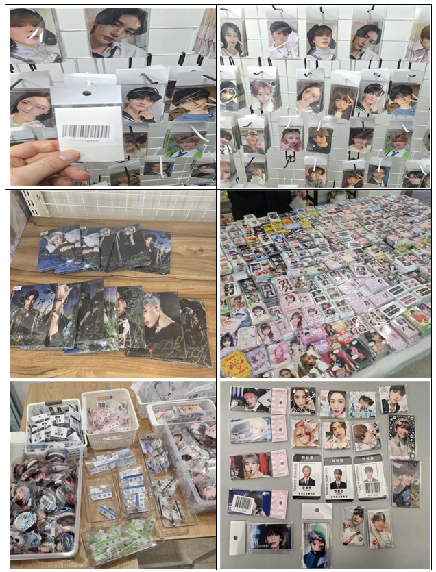 지식재산처는 지난해 11월부터 지난달까지 세종·시흥·부천·김해 등 오프라인 판매처 4곳과 온라인 플랫폼을 대상으로 행정조사를 벌였다. 이를 통해 ‘세븐틴, 보이넥스트도어, 투모로우바이투게더, 에스파, 아이브, 라이즈’ 등 6개 아이돌 그룹 소속 아티스트 41명의 예명 및 초상이 무단으로 사용된 상품이 불법으로 유통되고 있는 사실을 확인했다. 이들 업체들은 지난해 4월 피해자 측에 퍼블리시티권 침해 중단을 약속하고도 침해 행위를 지속해 온 것으로 드러났다. 판매중인 상품은 포토카드, 학생증형 카드, 스티커 등 5종으로 동일 디자인의 중복 재고를 포함할 경우 전체 판매 규모는 수 천장에 이를 것으로 추정된다.