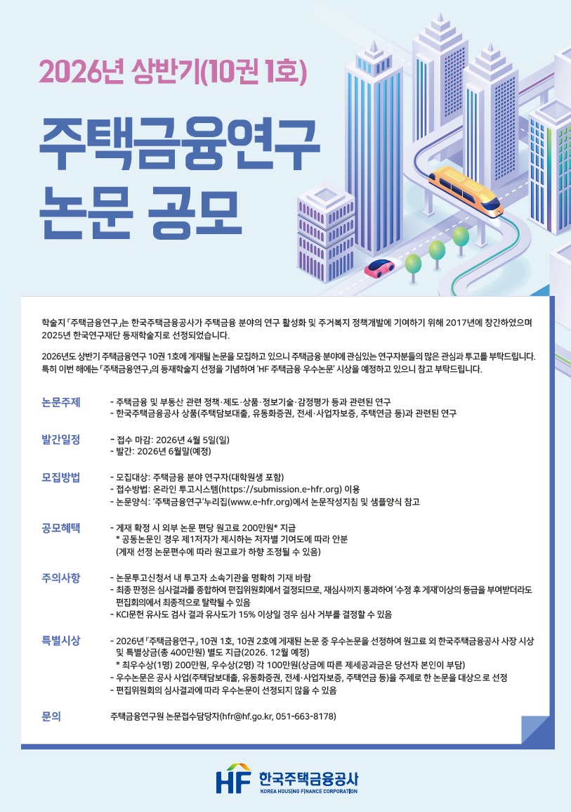 한국주택금융공사는 주택금융연구 활성화와 주거복지 정책 개발을 위한 ‘2026년 상반기 주택금융연구 논문 공모’를 실시한다고 5일 밝혔다.
