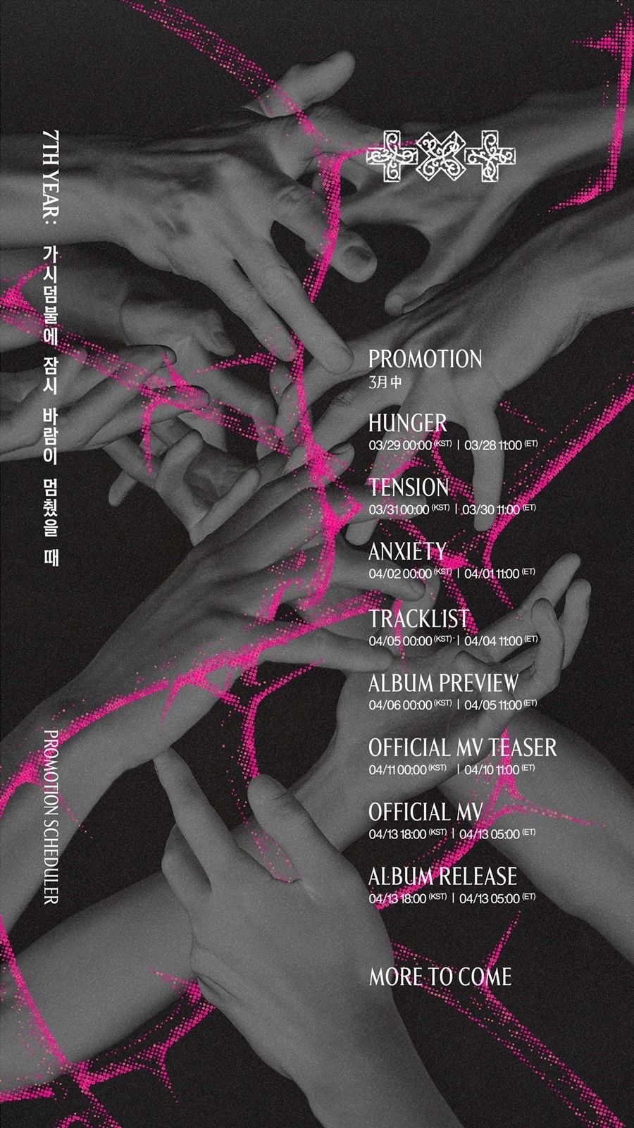 오는 3월 29일부터 4월 2일까지 'HUNGER', 'TENSION', 'ANXIETY' 버전의 사진이 추가적으로 베일을 벗는다. 이후 4월 5일 트랙리스트, 4월 6일 앨범 프리뷰가 공개돼 신보 윤곽이 드러난다. 4월 11일에는 타이틀곡 뮤직비디오 티저로 컴백 열기를 고조시킬 전망이다. 3월 중 전개되는 베일에 싸인 프로모션과 'MORE TO COME'이라는 문구는 전 세계 모아(MOA.팬덤명)의 호기심을 자극한다.