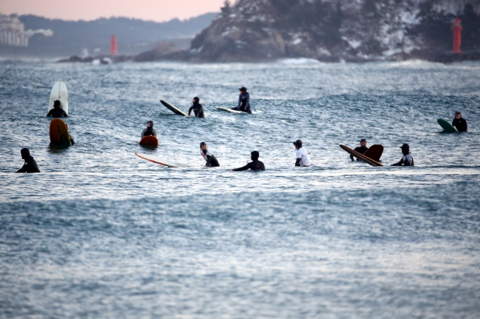 ▲강원 양양군 강현면 물치해변에서 서퍼들이 서핑을 즐기고 있다./사진=뉴시스 |