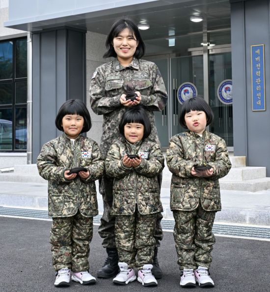해군 제8전투훈련단 소속 이은주 상사와 세쌍둥이 딸(왼쪽부터 장은진(첫째), 장소진(셋째), 장유진(둘째) 양, 5세)들이 지난달 26일 8전단 예하 예비전력관리전대 건물 앞에서 소아암 아동 돕기를 위해 자른 각 25cm 길이의 머리카락을 손에 들고 기념사진을 촬영하고 있다. 사진제공=해군 |