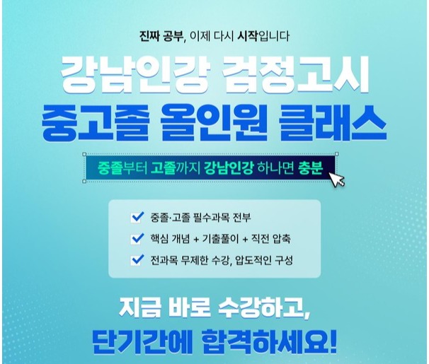 구는 교육 사각지대 해소를 위해 학교 밖 청소년에게 강남인강 연회비 5만 원을 전액 면제해 무료 수강을 지원한다. 일반 수험생도 연회비 5만 원으로 전 과목을 무제한 수강할 수 있어, 교육비 부담 없이 검정고시를 준비할 수 있도록 했다.