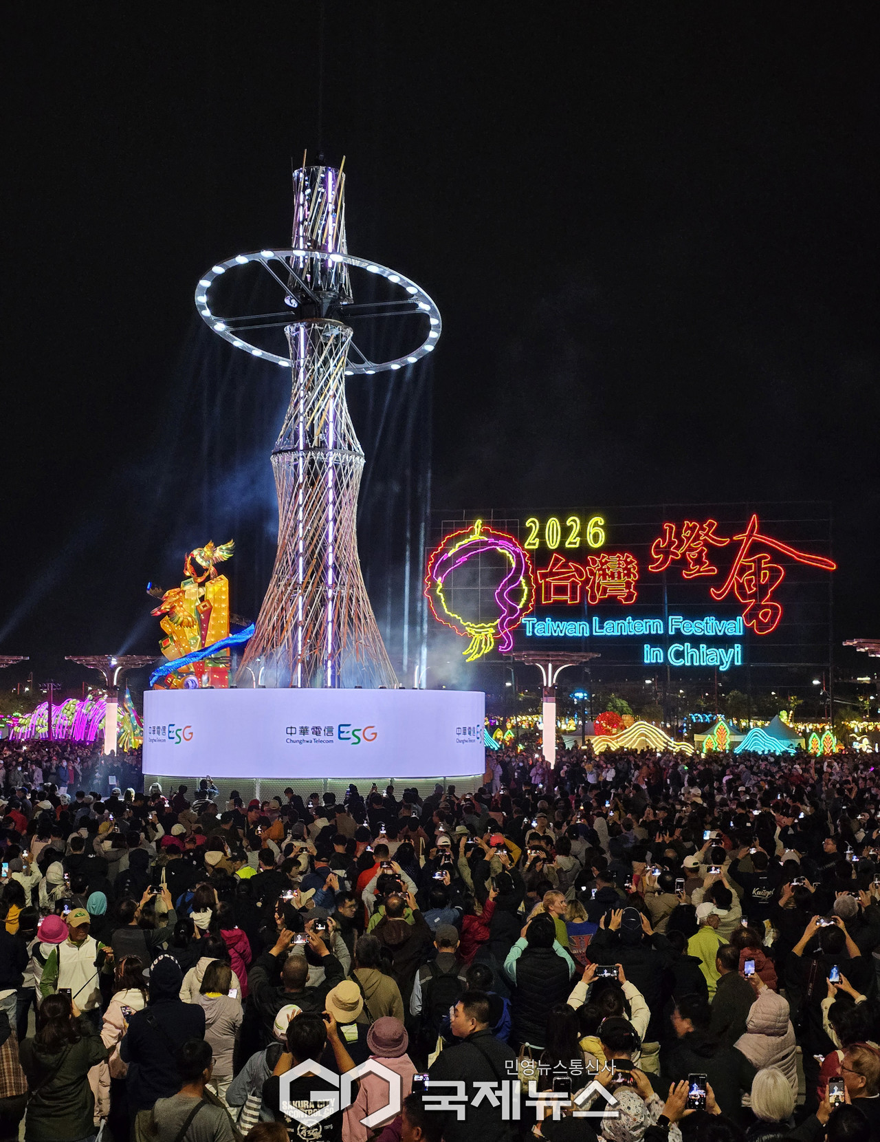 (대만=국제뉴스) 유지현 기자 = 3일 대만 자이현 정부청사 앞 광장에서 개막한 2026 대만 등불축제(臺灣燈會, Taiwan Lantern Festival)의 주등 '빛의 세례-세계의 아리산'이 점등되는 순간.