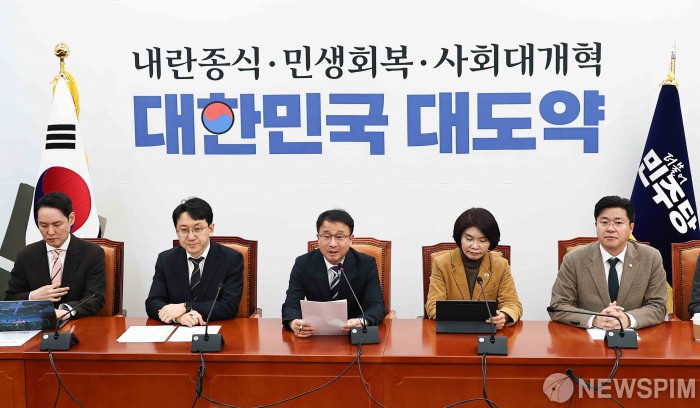 [서울=뉴스핌] 윤창빈 기자 = 한병도 더불어민주당 원내대표가 6일 오전 서울 여의도 국회에서 열린 정책조정회의에서 모두발언을 하고 있다. 2026.03.05 pangbin@newspim.com