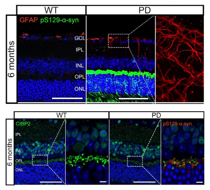 면역형광 분석을 이용해 망막을 관찰한 결과, 알파-시누클레인 과발현 마우스모델(PD)은 대조군(WT)과 비교해 질병 초기 단계(6개월)부터 알파-시누클레인(pS129-α-syn) 및 아교세포 염증반응(GFAP)이 유의하게 증가했고, 광수용체 시냅스 단백(CtBP2)이 유의하게 감소했다. |