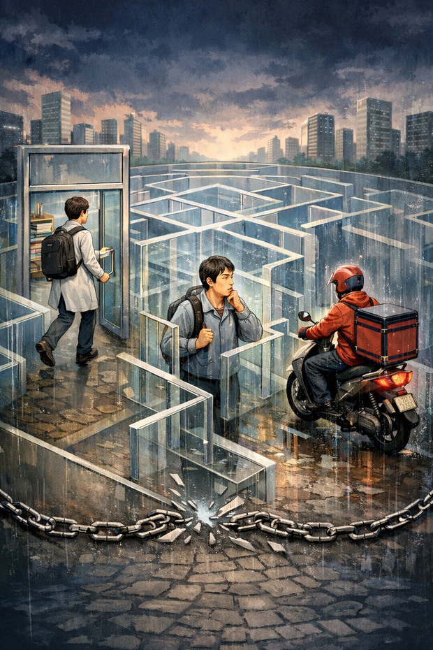 우리가 신봉하는 공정은 흔히 시험이라는 좁은 문을 통과하는 기계적 절차에 매몰되어 있다. 이러한 협소한 인식은 우리 사회를 거대한 유리 미로로 만들고 있다. 유리 미로는 단순히 성장을 가로막는 유리 천장과 다르다. 그것은 입구는 활짝 열려 있는 듯 보이지만, 보이지 않는 투명한 벽들이 복잡하게 얽혀 있어 특정 지도를 가진 자들만이 출구를 찾도록 설계된 기만적 구조를 의미한다.