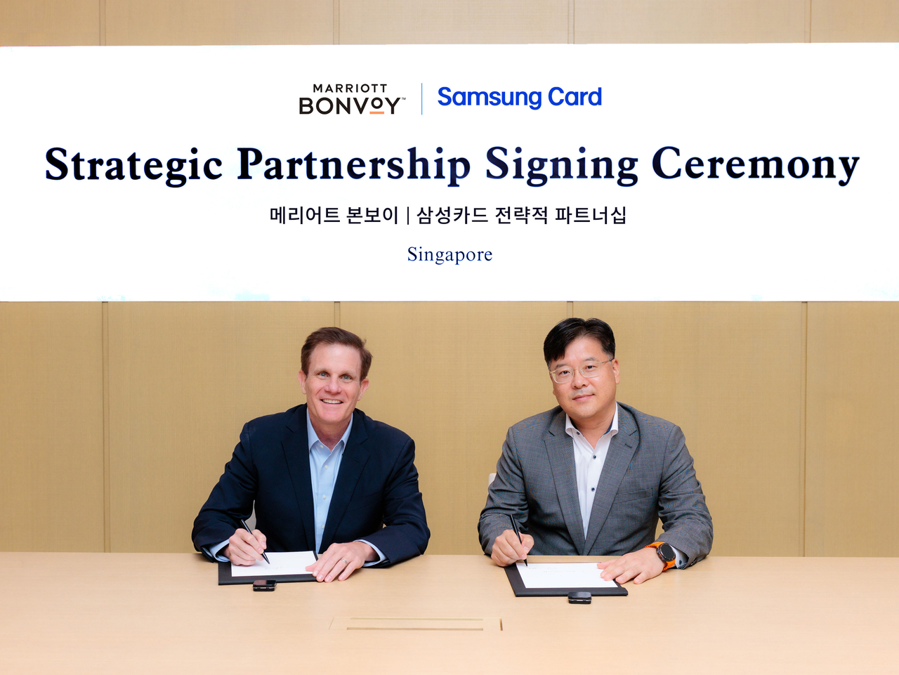 삼성카드와 글로벌 호텔 기업 메리어트 인터내셔널과 전략적 업무 협약을 체결했다. 삼성카드 김대순 부사장(오른쪽)과 메리어트 John Toomey 부사장(왼쪽)이 기념사진을 촬영하고 있다. [삼성카드] |