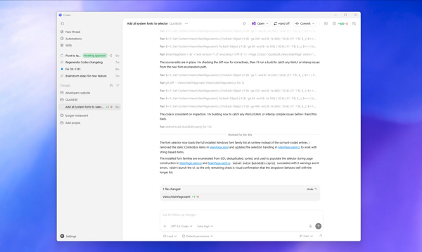 윈도용 코덱스 앱은 맥OS 버전과 마찬가지로 여러 코딩 에이전트가 하나의 작업에 협업하도록 조정하는 기능을 제공한다. 버그 테스트와 같은 반복적인 업무를 간소화하는 자동화 기능이 포함되었으며, 지침과 스크립트 등을 묶어 에이전트를 특정 도구 및 워크플로우에 연결하는 스킬 섹션도 별도로 마련됐다.