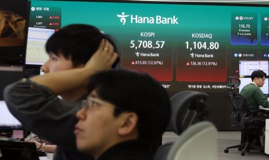 코스피가 장중 급등해 5700선을 회복한 5일 서울 하나은행 본점 딜링룸에서 직원들이 업무를 보고 있다. 이날 코스피는 전날보다 157.38p(3.09%) 오른 5,250.92로 원/달러 환율은 12.2원 내린 1,464.0원으로, 코스닥은 45.40p(4.64%) 오른 1,023.84로 장을 시작했다.