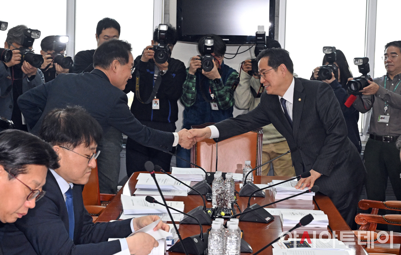 아시아투데이 송의주 기자 = 5일 국회에서 열린 제2차 법안심사소위원회(대미투자특별법 처리를 위한 특별위원회)에서 더불어민주당 허영(왼쪽)·국민의힘 박수영 의원이 악수하고 있다.