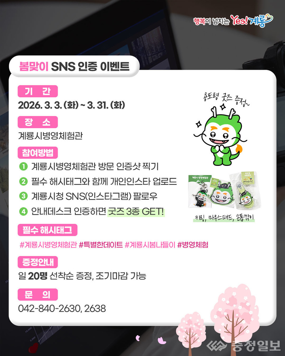 충남 계룡시는 3월 한 달 동안 계룡병영체험관 방문객을 대상으로 '봄맞이 SNS 인증 이벤트'를 진행한다고 밝혔다. 이 행사는 병영체험관 방문을 유도하고 4월에 열리는 '계룡 향적산 봄나들이' 행사를 알리기 위해 기획됐다.