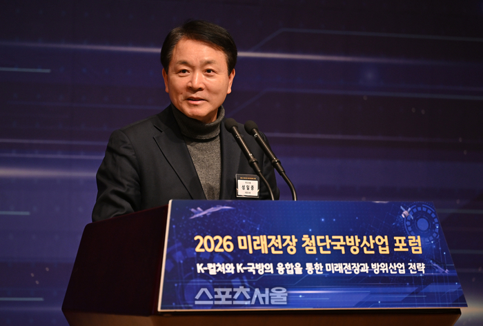 성일종 국회 국방위원회 위원장이 지난 4일 서울 중구 프레스센터에서 열린 ‘2026 미래 전장 첨단국방산업 포럼’에서 축사하고 있다. 사진 | 스포츠서울 DB |
