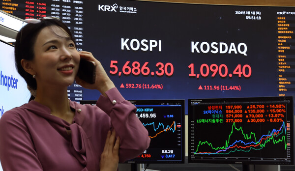 한국거래소에 따르면 5일 오전 10시 5분 기준 코스피 지수는 전 거래일 대비 584.31포인트(11.47%) 폭등한 5677.85를 나타내고 있다. 이날 지수는 전보다 157.38포인트(3.09%) 오른 5250.92로 출발해 장중 상승 폭을 키우고 있다.