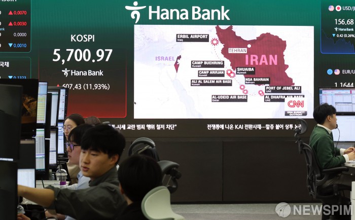 [서울=뉴스핌] 양윤모 기자= 뉴욕증시가 美·이란 접촉설에 반등한 가운데 5일 오전 코스피가 전장 종가보다 607.43 포인트(11.93%) 상승하며 5700.97로 거래를 시작한 가운데, 서울 중구 하나은행 을지로본점 딜링룸에 CNN화면이 송출되고 있다. 서울외환시장에서 달러/원 환율은 전장 대비 14.20원 하락한 1462.00원에 주간거래를 시작했다. 2026.03.05 yym58@newspim.com
