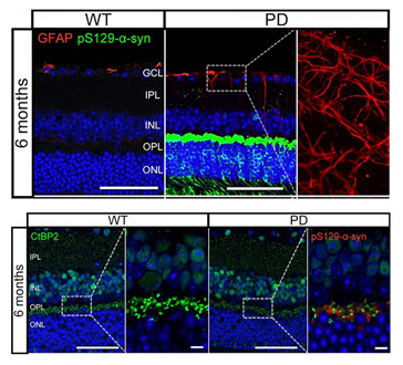 면역형광 분석을 이용해 망막을 관찰한 결과, 알파-시누클레인 과발현 마우스모델(PD)은 대조군(WT)과 비교해 질병 초기 단계(6개월)부터 알파-시누클레인(pS129--syn) 및 아교세포 염증반응(GFAP)이 유의하게 증가했고, 광수용체 시냅스 단백(CtBP2)이 유의하게 감소했다. |