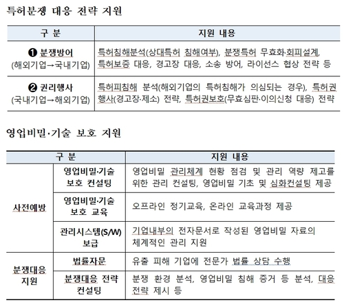 우리 기업을 대상으로 한 국제 특허분쟁 위협이 증가함에 따라 올해부터 첨단산업·전략기술에 대한 특허 분쟁대응 전략 사업 지원 한도도 확대하고, AI 기반 영업비밀·기술방지 시스템도 새로 구축한다.