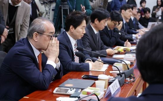 5일 국회 의원회관에서 열린 중동 현안 관련 더불어민주당-재계 긴급 간담회에서 재계 참석자들이 자리하고 있다. 왼쪽부터 정인섭 한화오션 사장, 윤영조 삼성전자 부사장, 이항수 현대자동차 부사장, 오태길 HD현대오일뱅크 부사장, 박석중 SK 경영경제연구소장, 고윤주 LG 글로벌전략개발원장, 안영모 GS칼텍스 정책부문장.