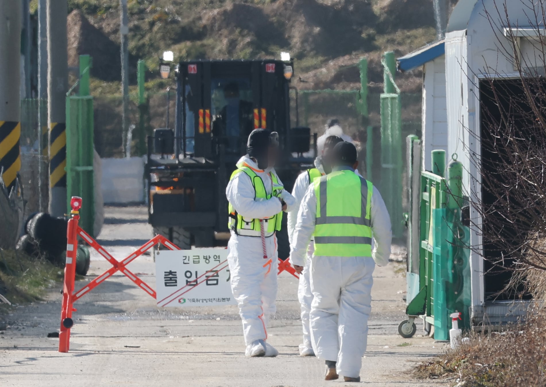 고병원성 조류인플루엔자(AI)가 발생한 한 농장에서 방역당국이 사람과 차량 통행을 막은채 방역 작업을 하고 있다. /뉴스1 |