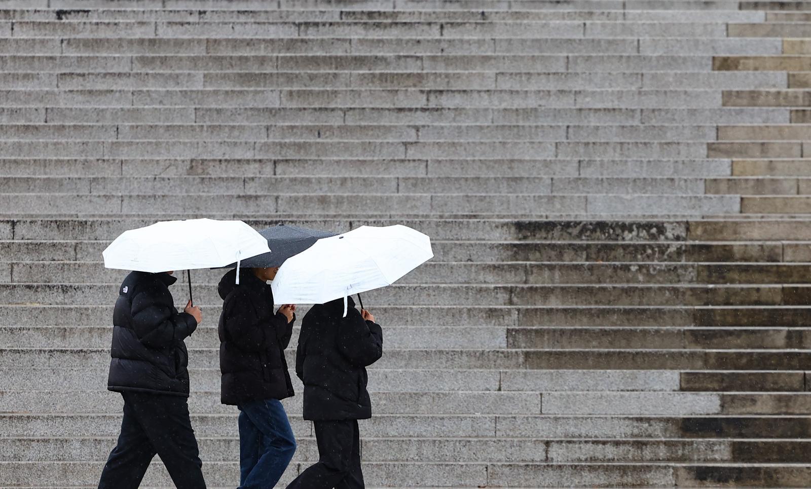 서울 여의도 한강공원에서 우산을 쓴 시민들이 발걸음을 재촉하고 있다. 2026.03.02 뉴시스 |