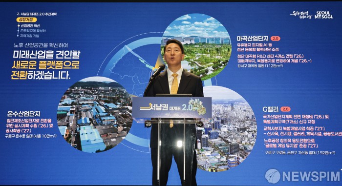 [서울=뉴스핌] 양윤모 기자 = 오세훈 서울시장이 5일 오전 서울시청 지하 1층 서울갤러리에서 개최된 '서남권 대개조 2.0' 기자설명회에 참석하고 있다. 오세훈 서울시장의 ‘서남권 대개조 2.0’은 1.0의 해당 성과를 동력 삼아 산업생태계를 고도화하는 것으로7조3000억원이 투입된다. 2026.03.05 yym58@newspim.com
