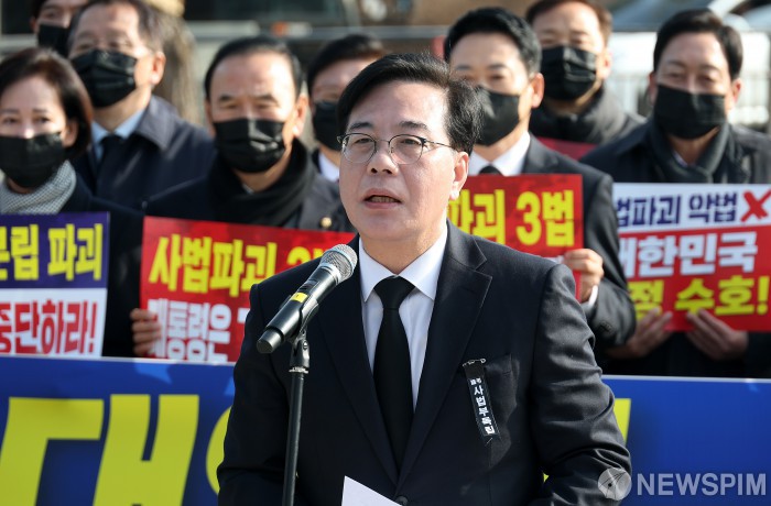 [서울=뉴스핌] 정일구 기자 = 송언석 국민의힘 원내대표가 5일 오전 서울 종로구 청와대 분수대 앞에서 열린 현장 의원총회에서 모두발언을 하고 있다. 2026.03.05 mironj19@newspim.com