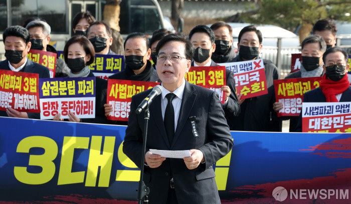 [서울=뉴스핌] 정일구 기자 = 송언석 국민의힘 원내대표가 5일 오전 서울 종로구 청와대 분수대 앞에서 열린 현장 의원총회에서 모두발언을 하고 있다. 2026.03.05 mironj19@newspim.com |