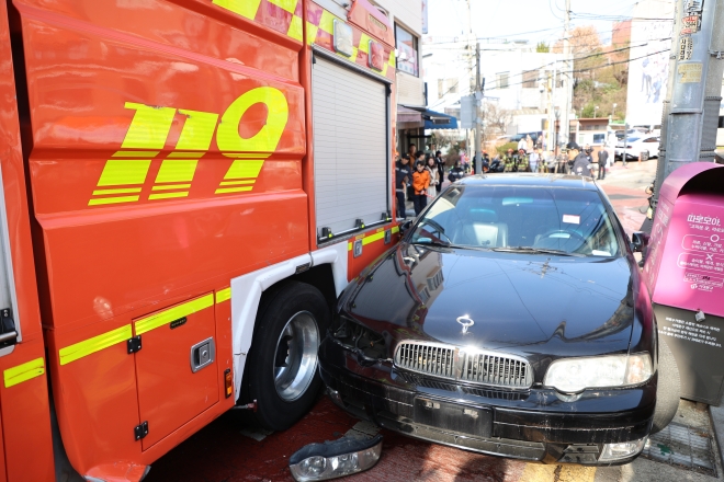 소방차량이 4일 서울 서대문구 소방영웅길 일대에서 열린 ‘긴급출동 방해 차량 강제처분’ 공개 훈련에서 좁은 골목 입구를 막은 불법 주차 차량의 범퍼 등을 파손하며 ‘강제진입’ 하고 있다. 서울시 제공 |