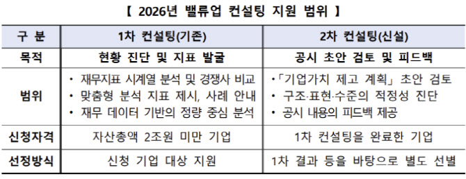 컨설팅 방식도 확대된다. 기존에는 재무지표 분석과 경쟁사 비교 등을 중심으로 한 ‘1차 컨설팅’이 이뤄졌지만 올해부터는 기업이 직접 작성한 기업가치 제고 계획 초안을 검토해주는 ‘2차 컨설팅’을 새로 도입한다.