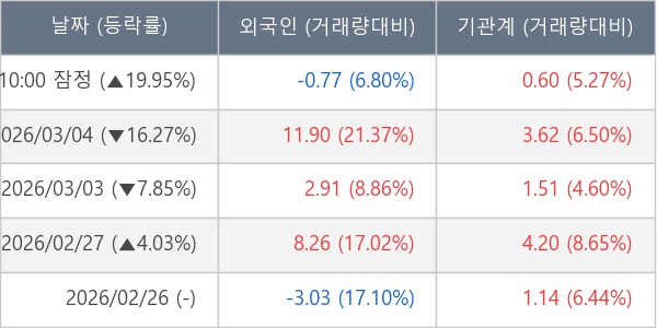 [서울=뉴스핌] 로보뉴스 = 05일 10시 15분 현재 대주전자재료(078600)는 전일 대비 19.95% (현재가 93,200원) 상승했고, 기관이 최근 10일 연속 순매수(누적 46.30만 주, 잠정) 행진을 하고 있다.