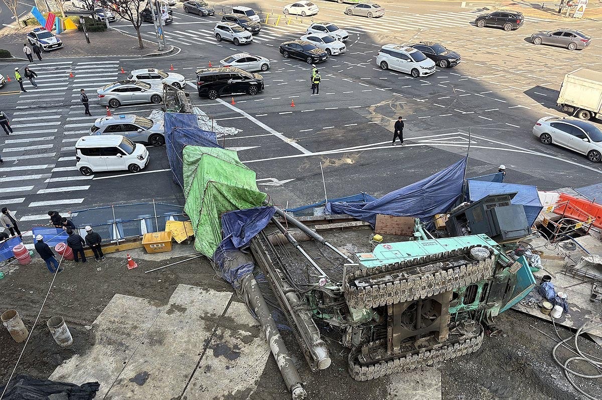 4일 오전 9시7분 대구 수성구 만촌역 지하 통로 공사 현장에서 작업 중이던 천공기가 도로 위에 쓰러져 있다. 연합뉴스 |