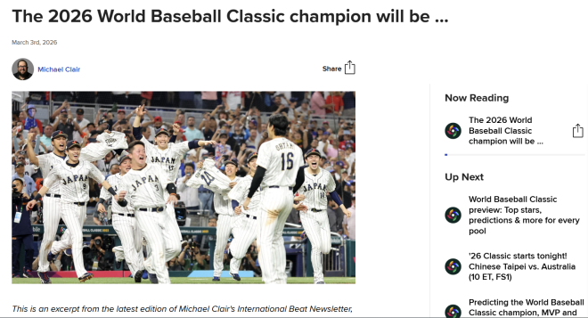 클레어 기자는 우리와 같은 C조에서 일본이 조 1위로 마칠 것이라고 예측했다. 2위에 대해서는 “프리미어12 우승을 딛고 올라왔고 유망한 투수진도 갖춘 만큼, 대만이 2위로 통과할 수 있다”고 내다봤다. 반면 하루 전인 4일 MLB닷컴 자체 기자단 투표에서는 C조에서 일본이 1위, 한국이 2위를 차지할 것이라는 전망이 나왔다.
