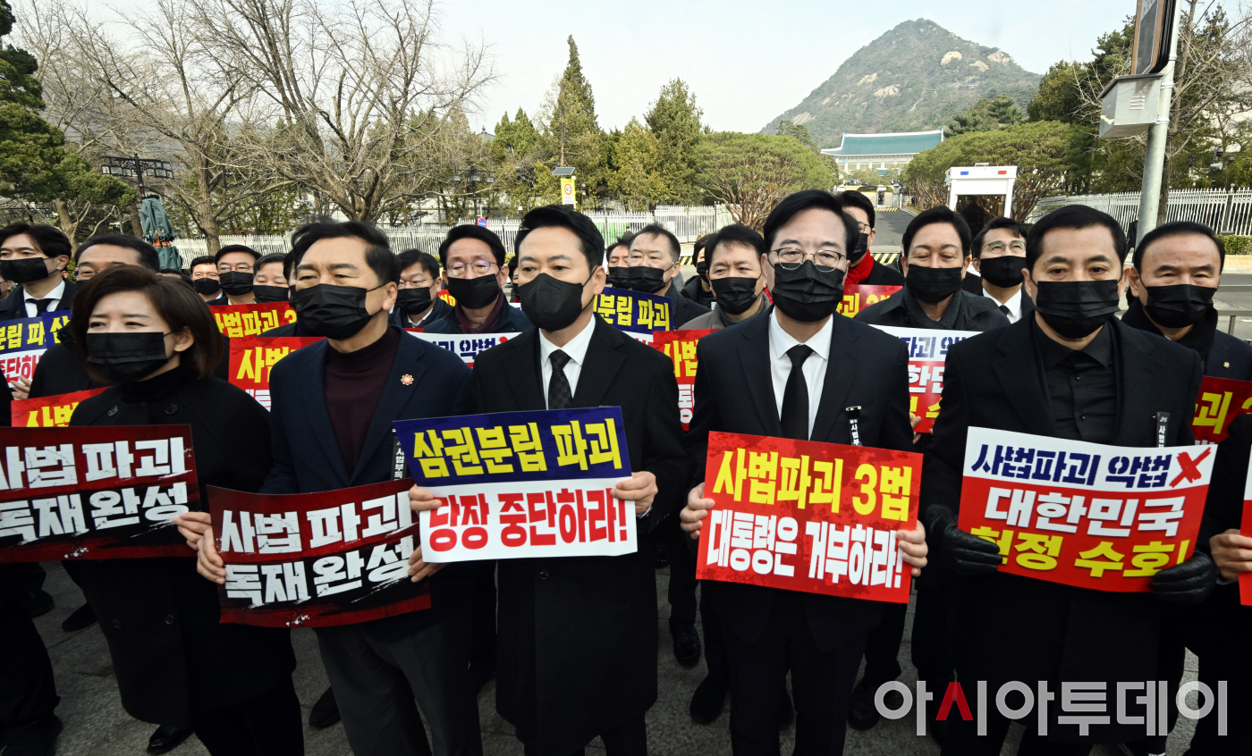 아시아투데이 박성일 기자 = 장동혁 국민의힘 대표, 송언석 원내대표를 비롯한 의원들이 5일 오전 서울시 종로구 청와대 사랑채 분수대 앞에서 열린 '사법파괴 3대 악법 거부권 행사 촉구' 현장 의원총회를 마치고 청와대앞에서 침묵시위를 하고 있다.