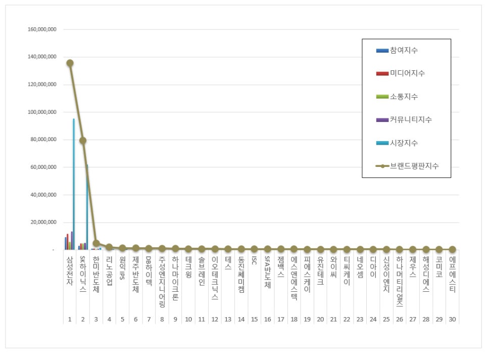 1위를 기록한 삼성전자 브랜드는 참여지수 9,461,698, 미디어지수 11,638,347, 소통지수 5,727,259, 커뮤니티지수 13,595,939, 시장지수 95,514,400으로 브랜드평판지수 135,937,643으로 집계됐다.2위 SK하이닉스 브랜드는 참여지수 3,027,178, 미디어지수 4,690,431, 소통지수 4,801,680, 커뮤니티지수 4,971,460, 시장지수 62,071,288으로 브랜드평판지수 79,562,038으로 나타났다.