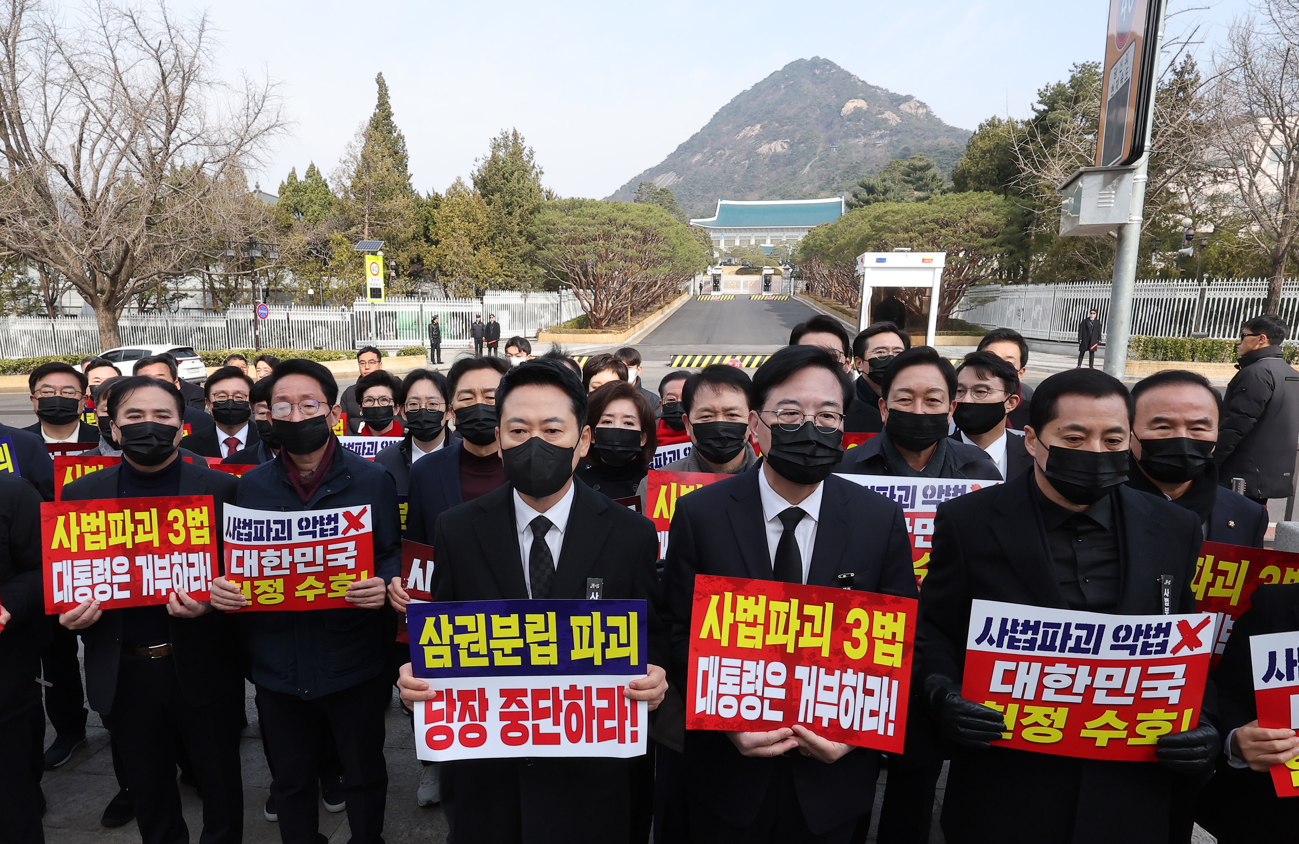 국민의힘은 이날 현장 의총 직후 ‘대한민국 국민을 위해 사법파괴 3대악법 철회를 요구한다’는 내용의 요구서를 정을호 청와대 정무비서관에게 전달했다. 이후 청와대 방향으로 도보 행진을 진행했다.