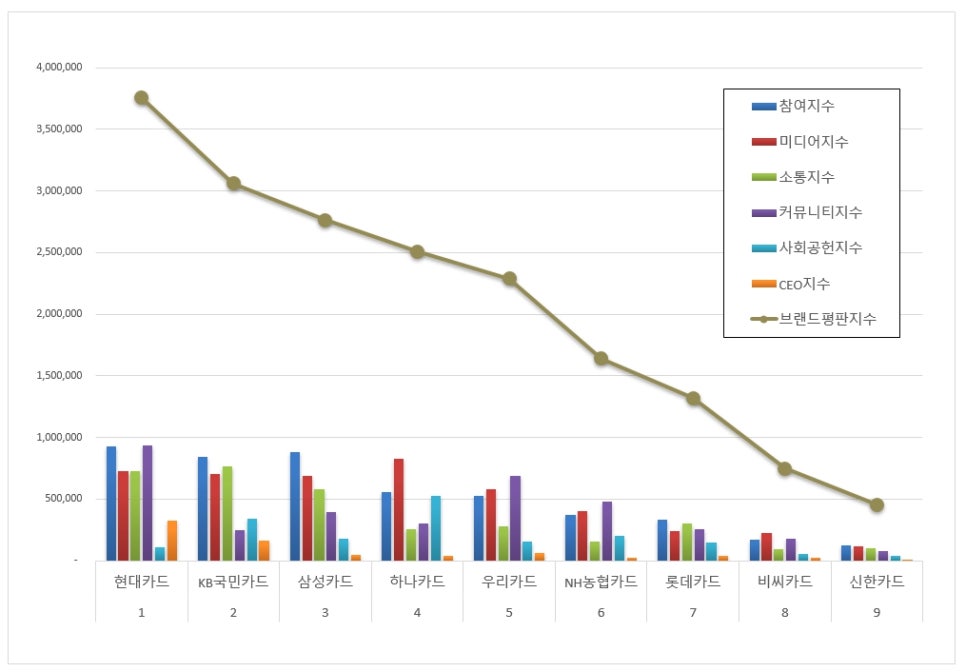 5위 우리카드는 참여지수 527,922, 미디어지수 577,232, 소통지수 279,311, 커뮤니티지수 687,551, 사회공헌지수 152,075, CEO지수 66,603으로 브랜드평판지수 2,290,693으로 집계됐다.
