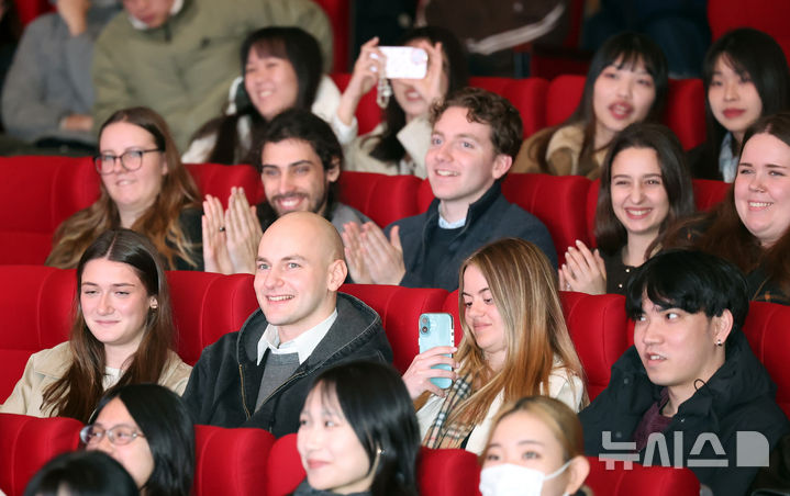 [부산=뉴시스] 하경민 기자 = 2026학년도 1학기 국립부경대학교 외국인 신입생 오리엔테이션이 열린 27일 부산 남구 부경대 대학극장에서 외국인 유학생들이 축하공연을 즐기고 있다. 이번 학기 부경대에는 학부생 135명, 대학원생 87명 등 41개국 433명의 유학생이 입학했다. 2026.02.27. yulnetphoto@newsis.com |