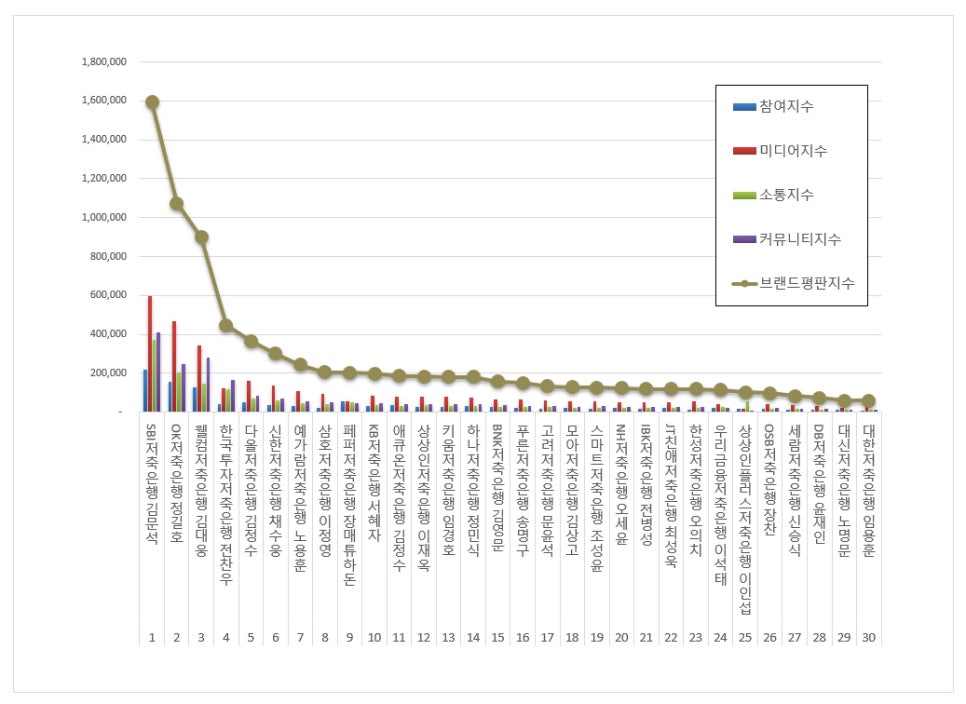 1위를 기록한 SBI저축은행 김문석 브랜드는 참여지수 216,343, 미디어지수 598,698, 소통지수 369,452, 커뮤니티지수 409,032로 브랜드평판지수 1,593,524로 집계됐다.2위 OK저축은행 정길호 브랜드는 참여지수 157,907, 미디어지수 469,562, 소통지수 201,764, 커뮤니티지수 245,054로 브랜드평판지수 1,074,287로 나타났다.