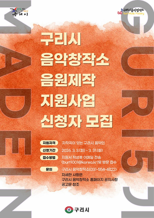 신청은 4월 3일까지 구리시 음악창작소 전자우편(으로 신청하면 된다. 주민등록상 주소지(또는 학교·직장)가 구리시이며, 자작곡을 보유한 시민이라면 누구나 지원할 수 있다. 자세한 사항은 구리시 음악창작소로 문의하면 된다.