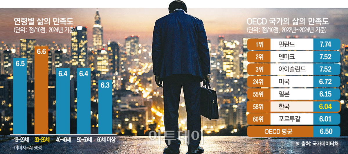 다른 나라와 비교해보면 우리나라 삶의 만족도는 여전히 최하위권이었다. 세계행복보고서의 국제 비교 결과를 보면 한국의 삶의 만족도는 2022∼2024년에 6.04점으로 OECD 평균(6.50점)보다 0.46점 낮았다. 38개국 중 만족도 순위는 33위로 하위권이었다. 전체 조사 대상인 147개 국가 중에 한국은 58위다. 우리나라보다 만족도가 낮은 나라는 포르투갈, 콜롬비아, 헝가리, 그리스, 튀르키예 등이었다.