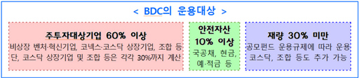 BDC는 비상장 벤처·혁신기업과 코넥스·코스닥 상장기업 등에 투자하는 상장 공모펀드다. 자산의 60% 이상을 벤처기업, 창업기업, 신기술사업자 등 혁신기업과 벤처조합 지분, 코넥스·코스닥 상장기업 등에 투자해야 한다.