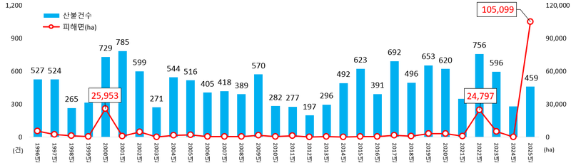 또 최근 30년간(1996~2025년) 산불은 연평균 477건 발생하며 6458ha의 산림을 태웠다. 특히 최근에는 피해 규모가 100ha 이상인 대형 산불이 증가하는 추세다. 2025년 한 해에만 산불로 인해 10만5099ha의 산림이 소실됐다. 이는 1996년부터 2024년까지 29년간 산불 피해 면적 8만8628ha를 뛰어넘는 수치다. 2025년 3월 22일 발생한 동시다발 대형 산불로 하루 동안 10만534ha의 산림이 소실됐다. 피해 지역은 경북 의성 안계면 5만2707ha, 안평면 4만6575ha, 금성면 134ha, 울산 울주 온양면 1117ha다.