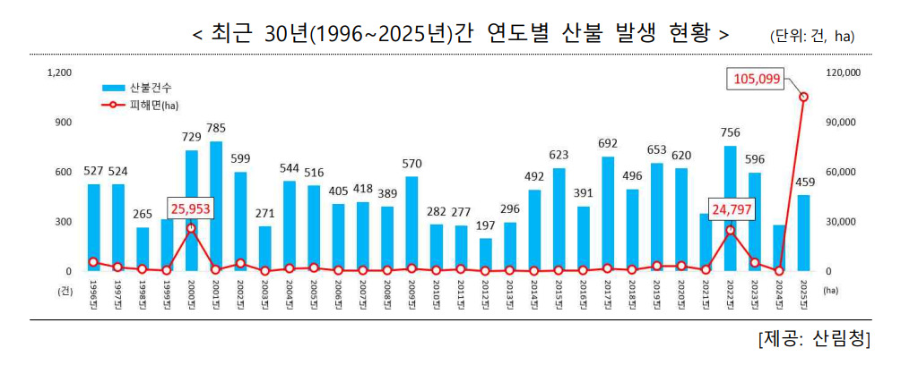 2025년 한 해에만 산불로 10만5099ha의 산림이 불에 탔는데, 이는 1996년부터 2024년까지 누적 피해 면적(8만8628ha)을 넘어서는 규모다.