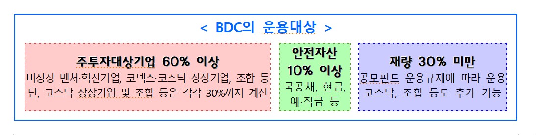 BDC는 비상장 벤처·혁신기업과 코넥스·코스닥 상장기업 등에 자산의 60% 이상을 투자하는 상장 공모펀드다. 투자 대상에는 벤처기업, 창업기업, 신기술사업자 등이 포함되며 주식이나 전환사채(CB)·교환사채(EB)·신주인수권부사채(BW) 등 주식연계채권 매입 또는 대출 방식으로 투자할 수 있다. 다만 금전 대여는 전체 투자금액의 40% 이내로 제한된다.
